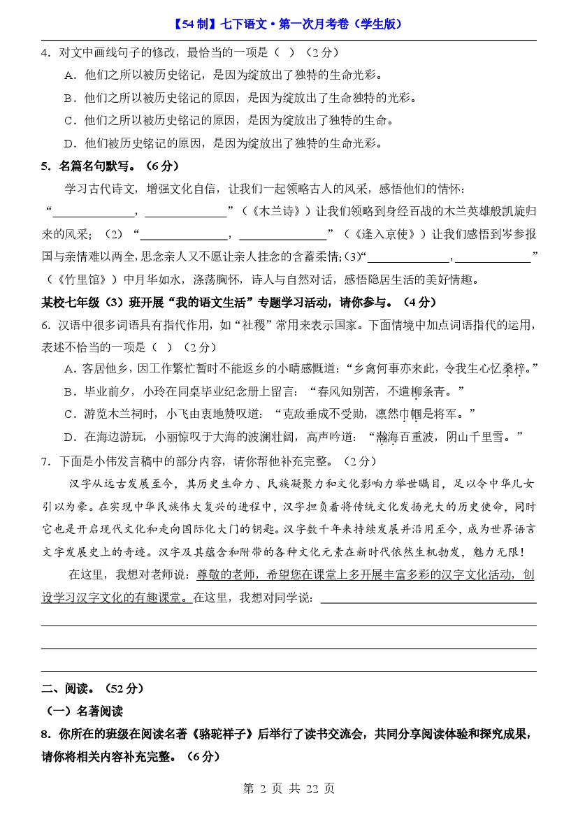 初中 2025年春【54制】7下语文第1次月考【第1-2单元】