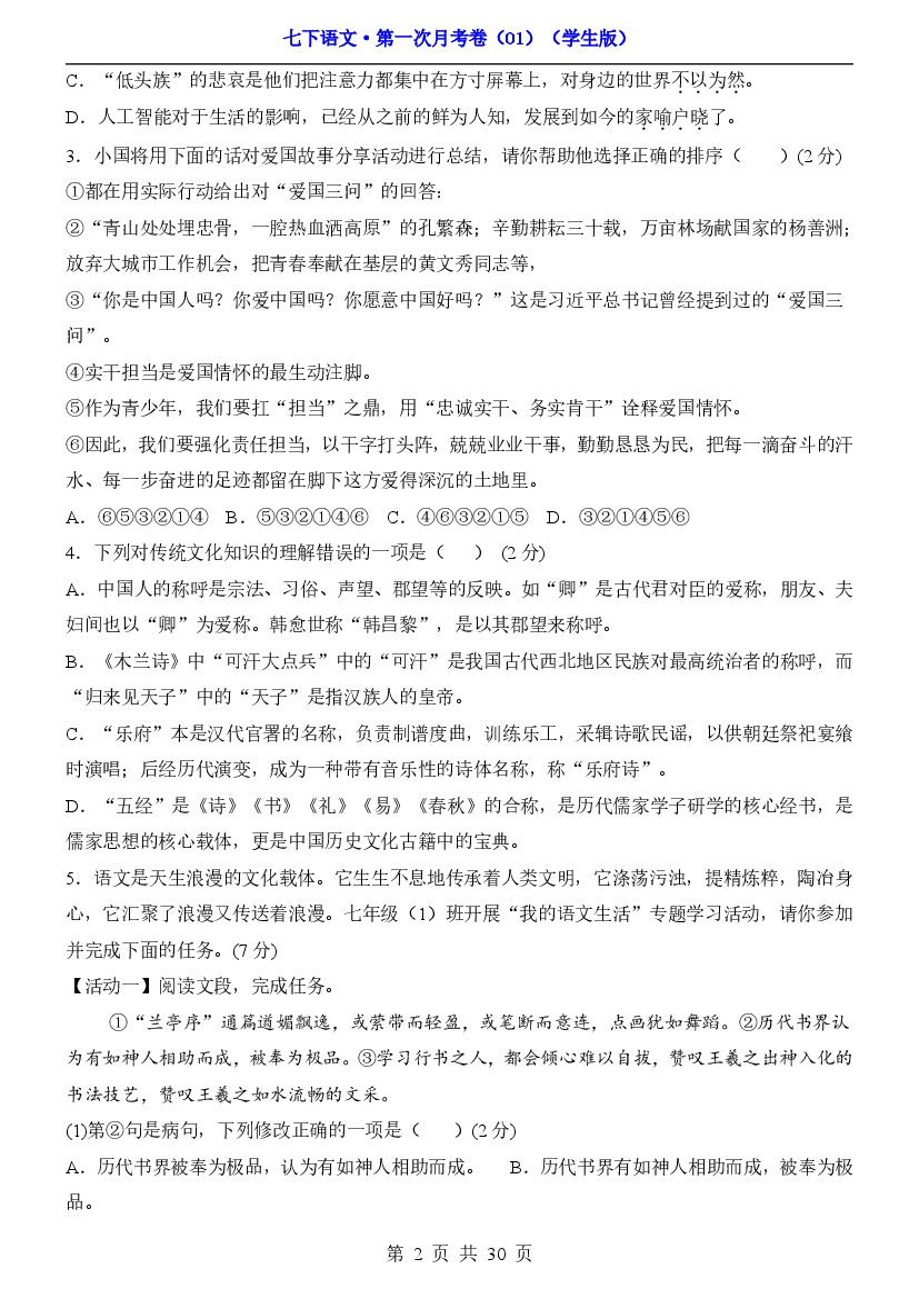初中 2025年春七年级下语文第1次月考01【第1-2单元】