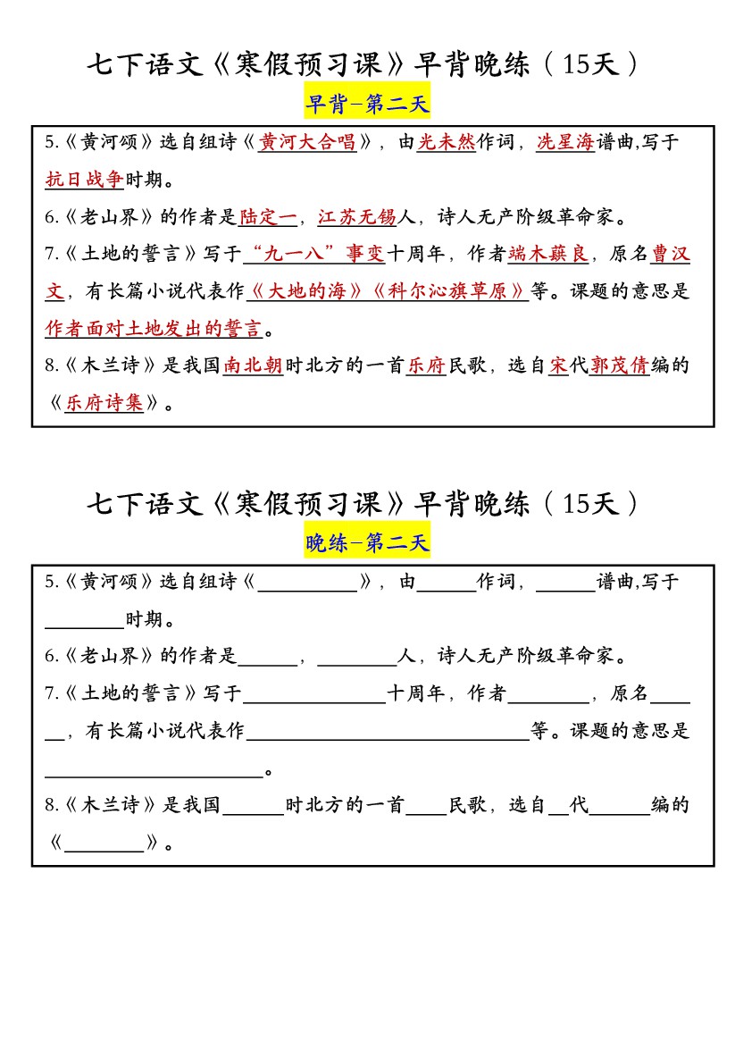 2025春七下语文《寒假预习课》早背晚练(15天)