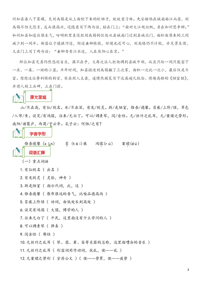 初中 2025年春七下语文文言文古诗词-专题03《陋室铭》知识汇总(部编版)