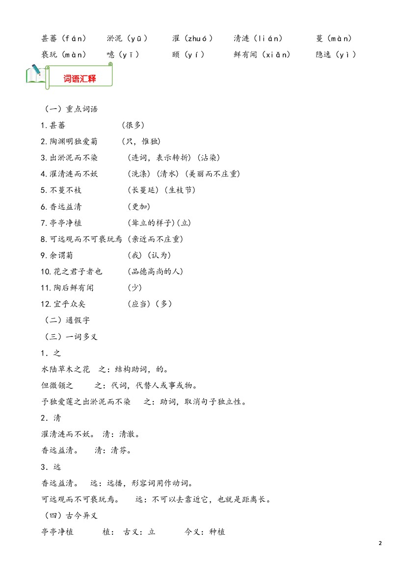 初中 2025年春七下语文文言文古诗词-专题04《爱莲说》知识汇总(部编版)