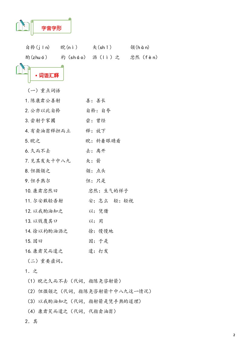 初中 2025年春七下语文文言文古诗词-专题02《卖油翁》知识汇总(部编版)