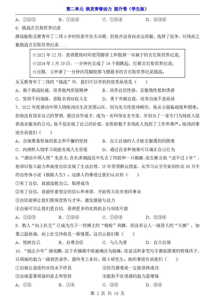 初中 2025年七下道法单元检测卷第2单元焕发青春活力(提升卷)