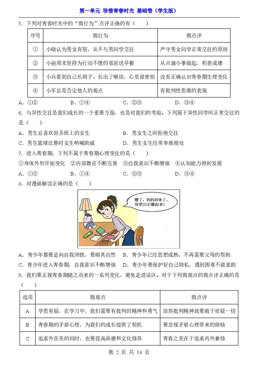 初中 2025年七下道法单元检测卷第1单元珍惜青春时光(基础卷)