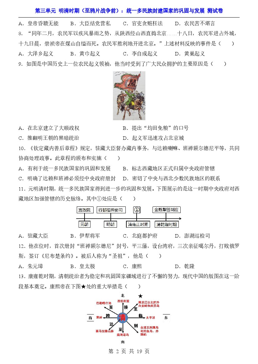 初中 2025年【七下历史】单元测试卷第3单元明清时期(至鸦片战争前)(测试卷)