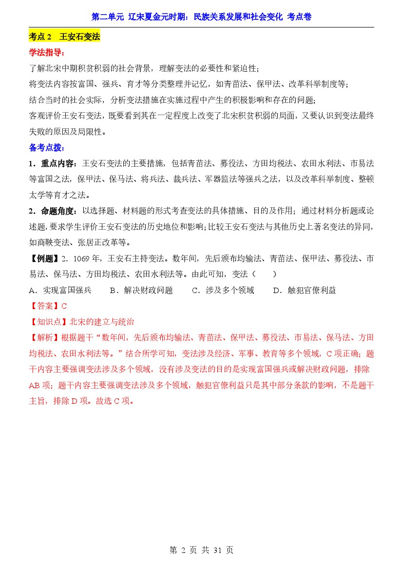 初中 2025年【七下历史】单元测试卷第2单元辽宋夏金元时期(考点卷)