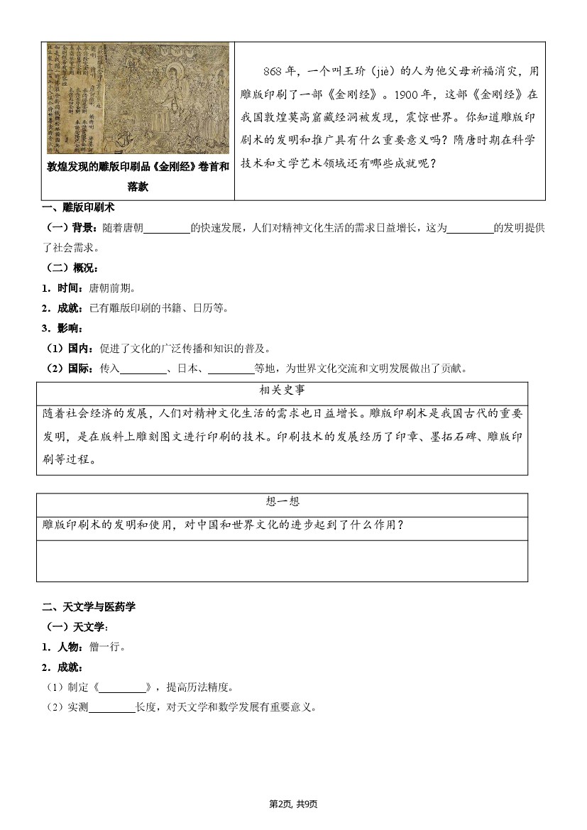 【七下历史】新七下第7课隋唐时期的科技与文化(原卷版)