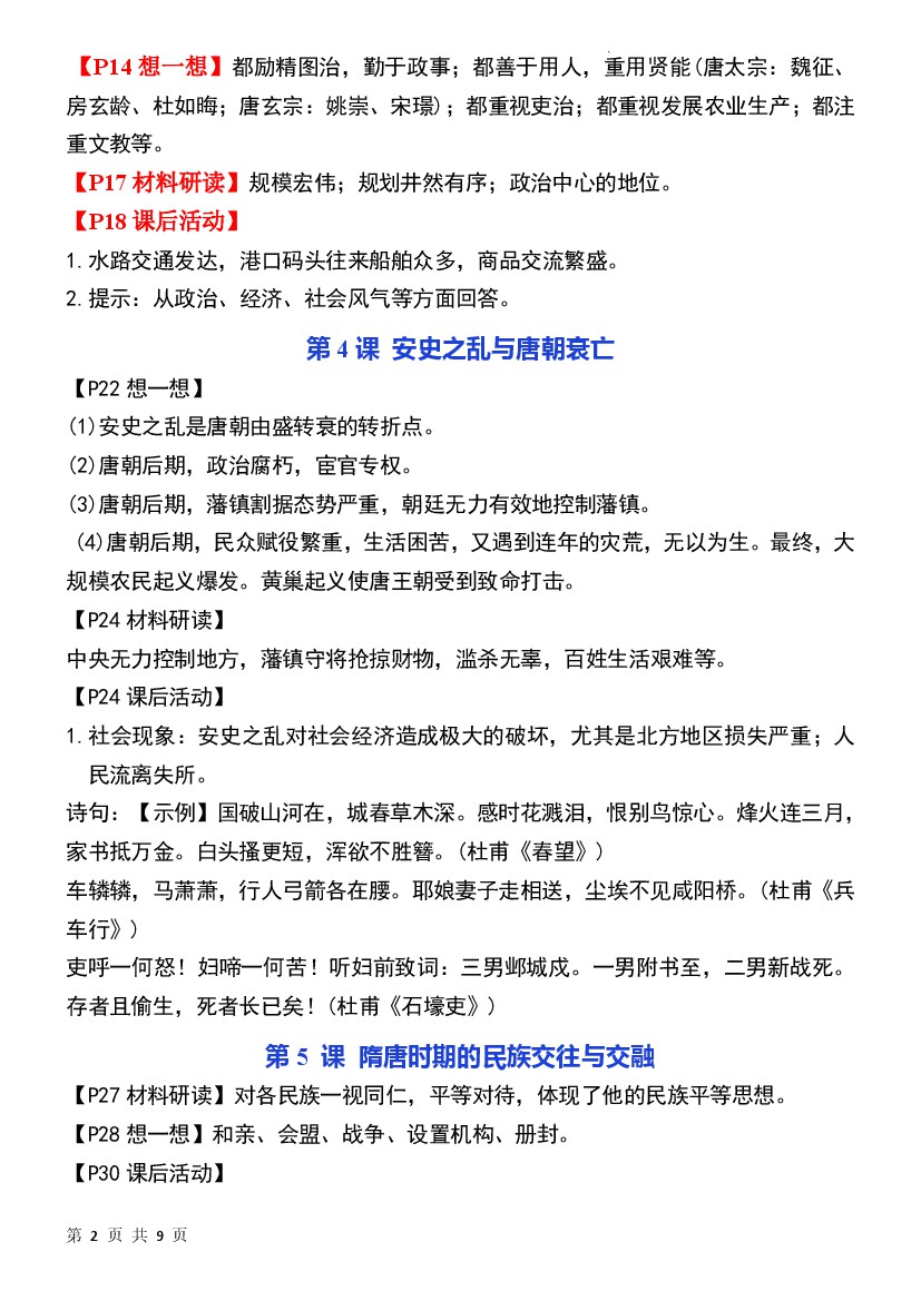 初中 教材习题答案2024-2025学年统编版七年级历史下册