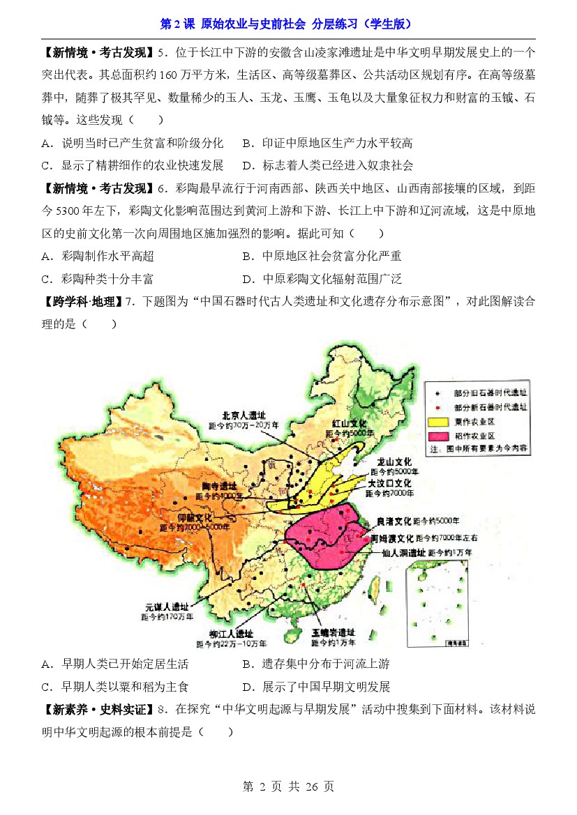 七上历史统编版第2课 原始农业与史前社会(分层练习)