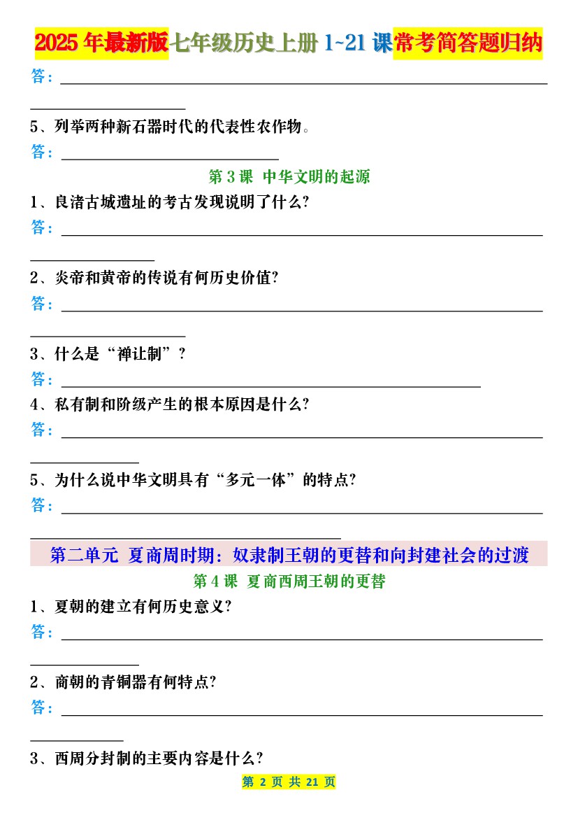 初中 2025年最新版七年级历史上册1~21课常考简答题归纳