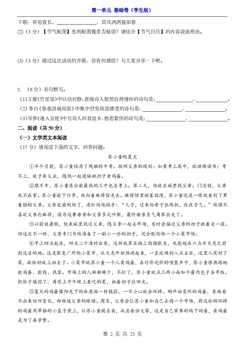 25春七年级下册语文单元检测第1单元(基础卷)