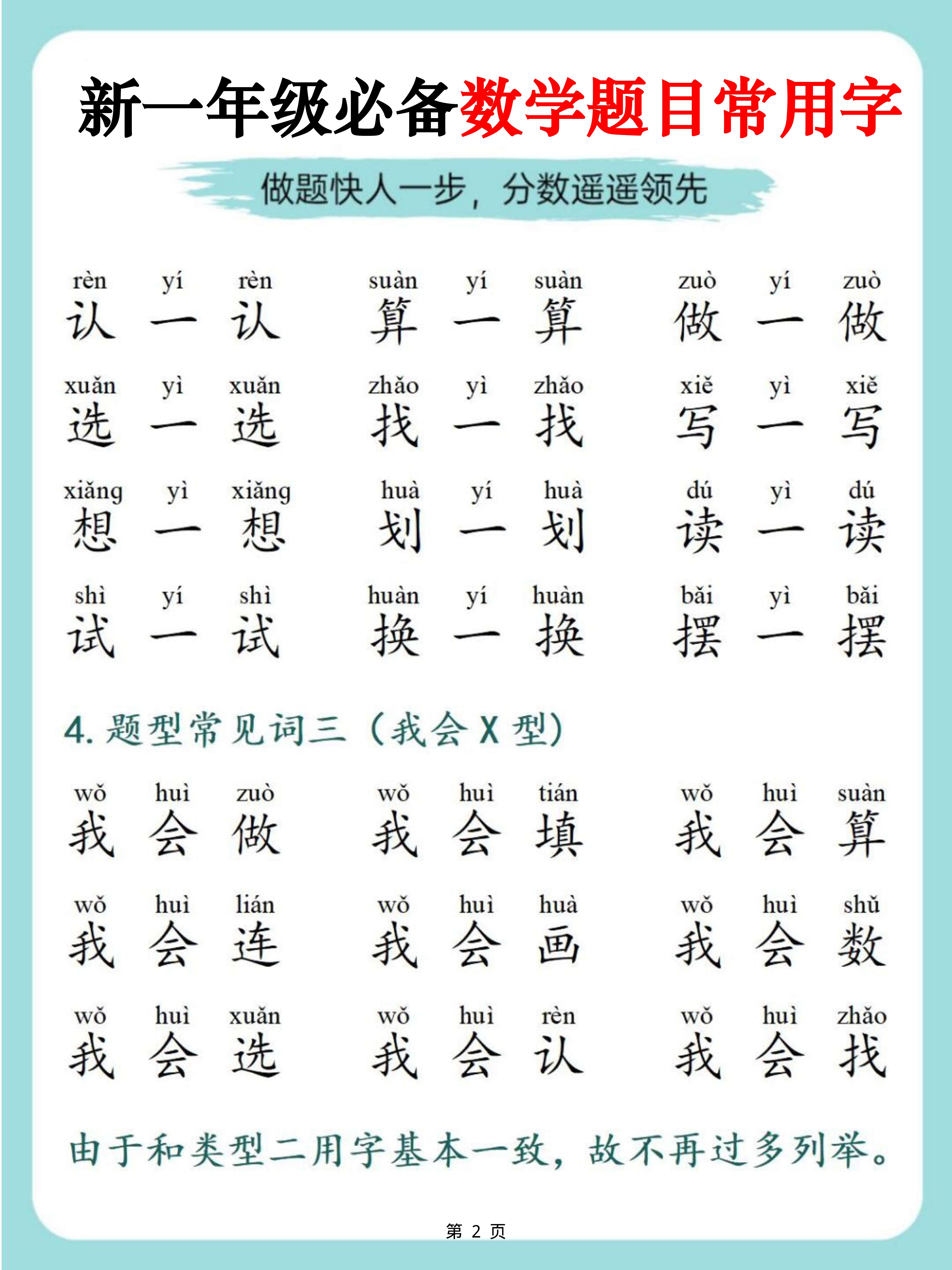 首页 > 全部 > 知识要点 > 新一年级必备数学题目常用字9页