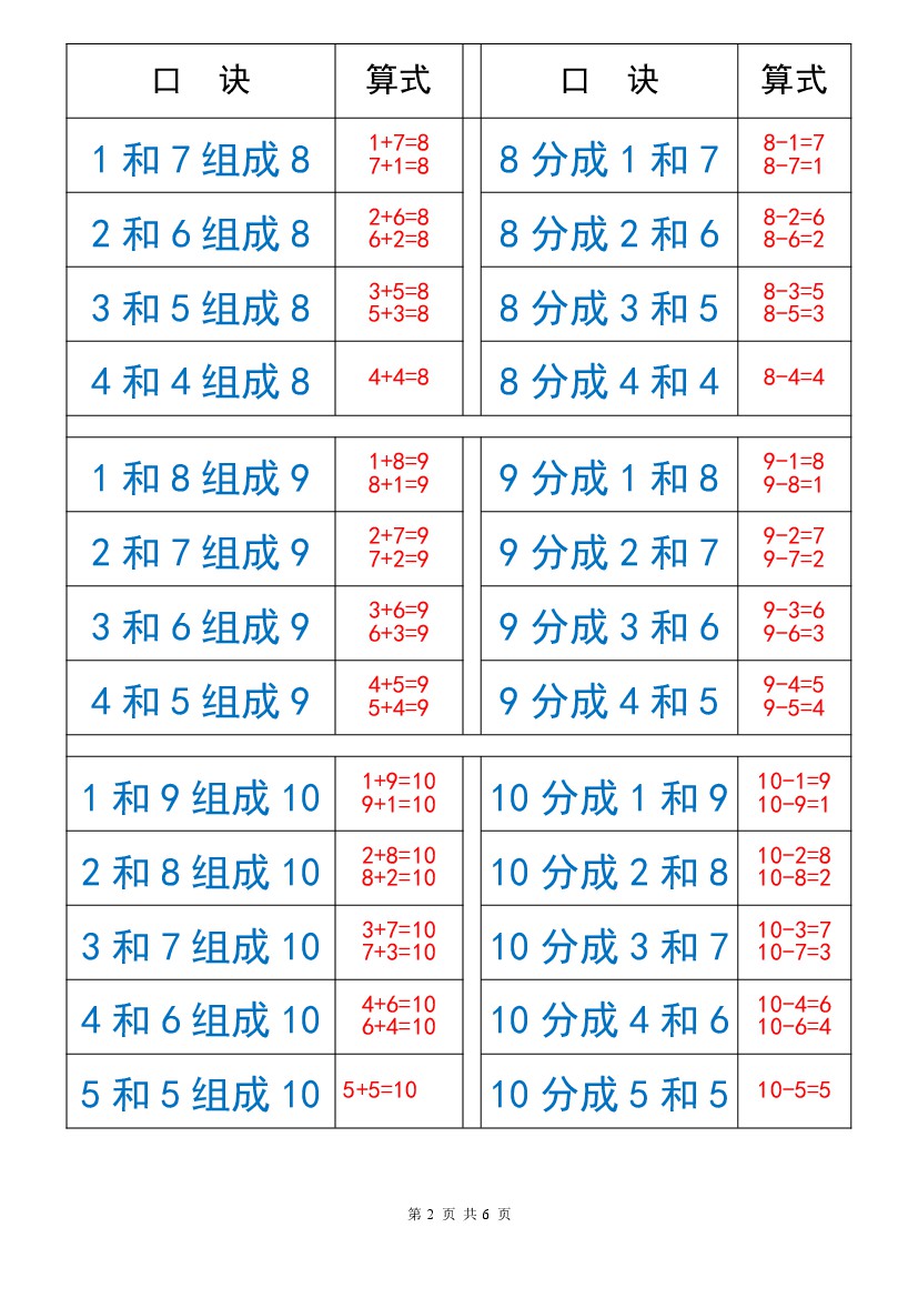 小学 一(上)数学以内数的组成与分解