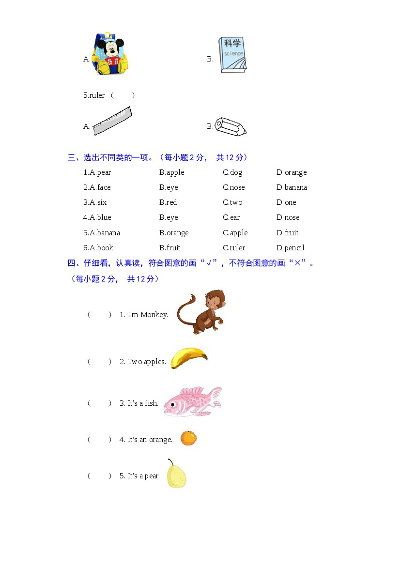 首页 > 全部 > 单元测试 > 一上英语(人教版)(06)--第六单元能力提升卷-Unit 6 Fruit