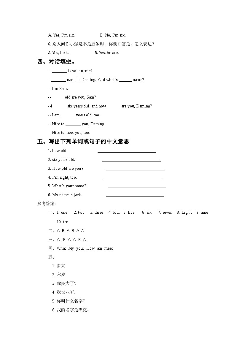 小学 外研一起一上英语Module 9 Unit 1 How old are you 同步练习3