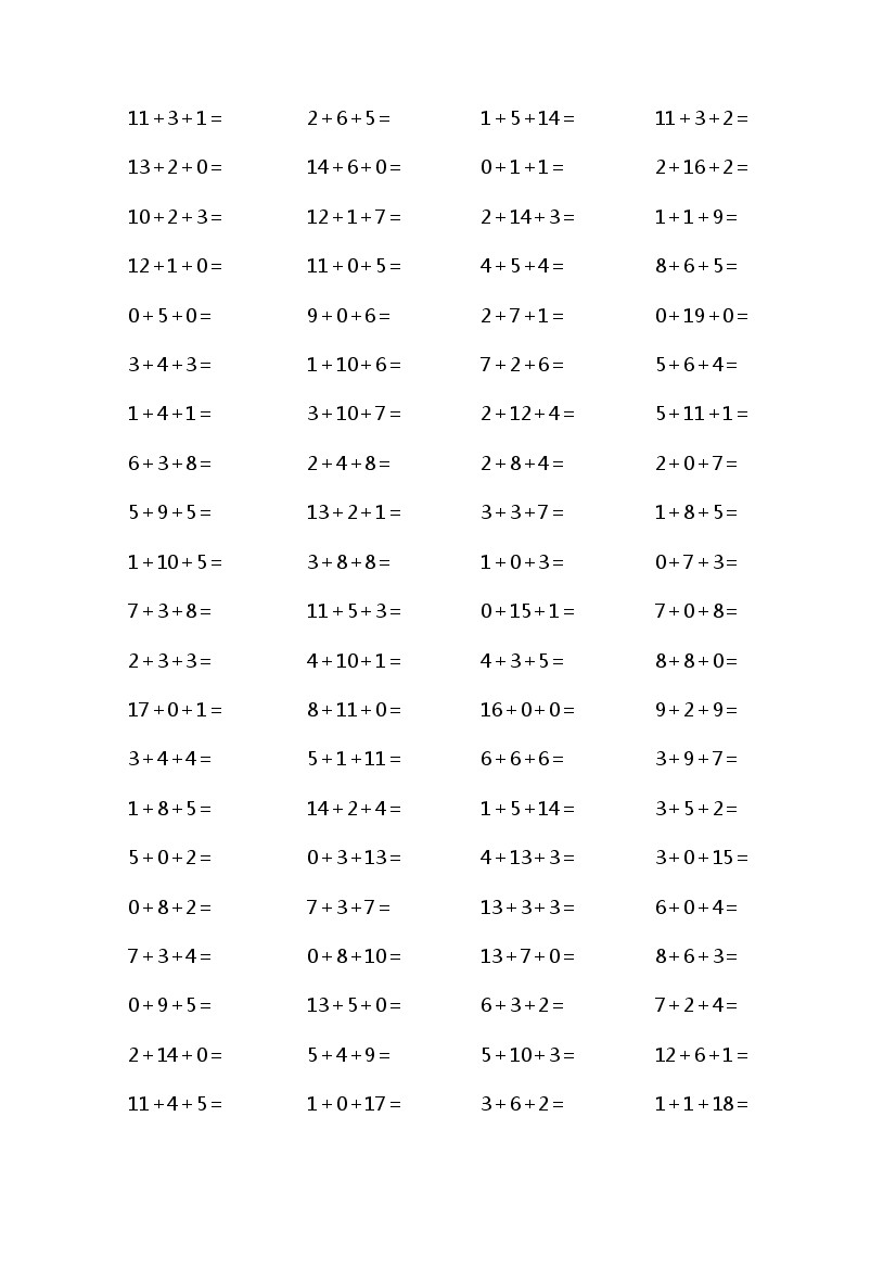 首页 > 全部 > 口算计算 > 一(上)数学20以内连续加法口算