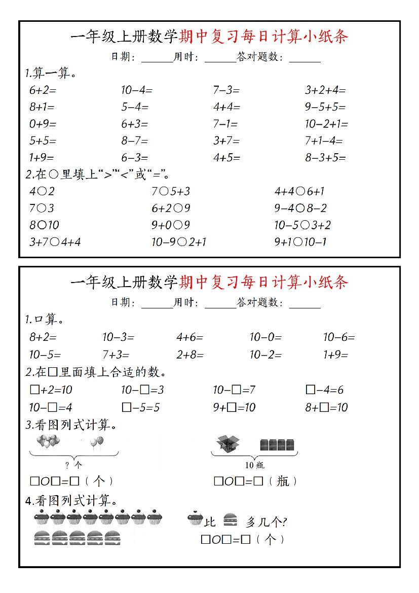 首页 > 全部 > 口算计算 > 一年级(上)数学 期中复习计算题每日一练