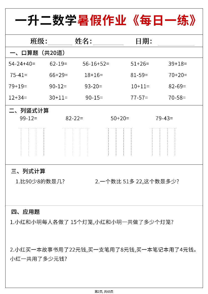 一升二数学【暑假作业每日一练60天附答案】