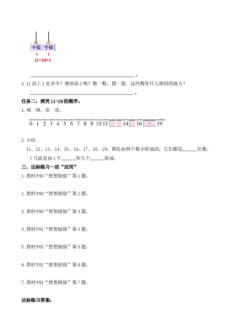 小学 一年级上册第五单元 第1课时 11-19的认识(学习任务单)-(苏教版•2025秋)