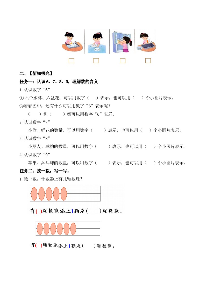 小学 一年级上册第二单元 第1课时 6-9的认识(学习任务单)-(苏教版•2025秋)