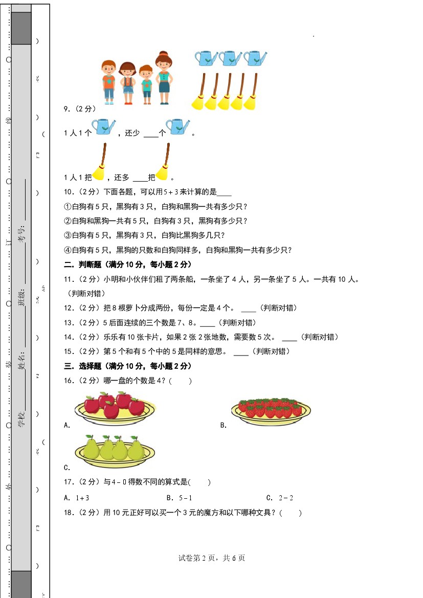 小学 【青岛54数学月考卷】2024-2025学年一上数学第一次月考(第一二单元含答案)