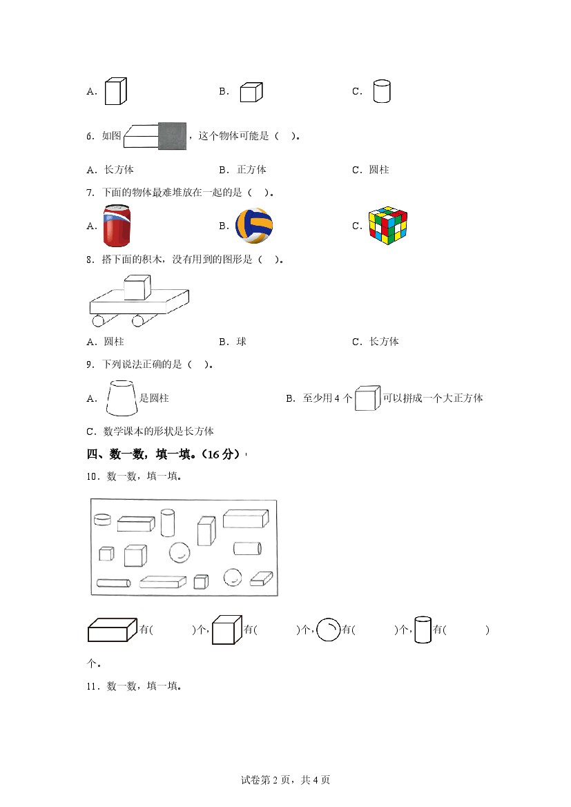 首页 > 全部 > 单元测试 > 人教版数学一年级上册第三单元《认识立体图形》单元测试卷
