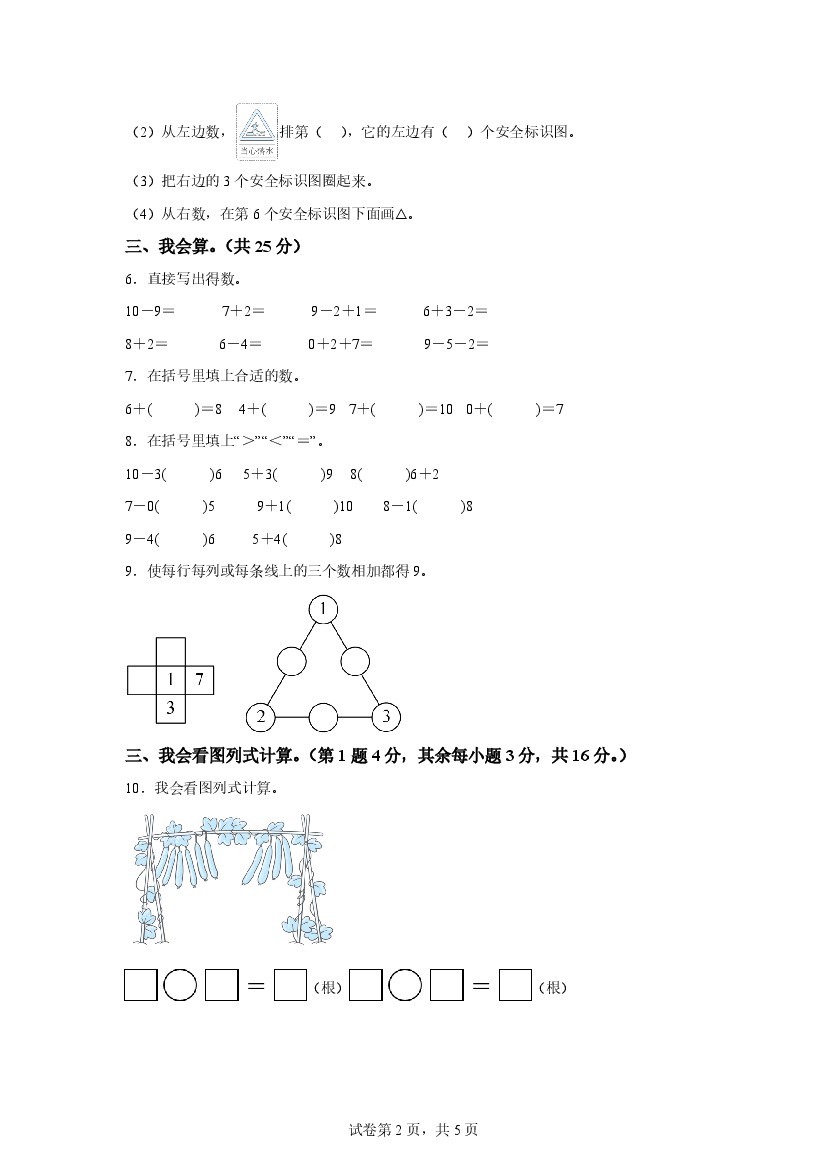 首页 > 全部 > 单元测试 > 人教版数学一年级上册第二单元《6~10的认识和加、减法》单元测试卷