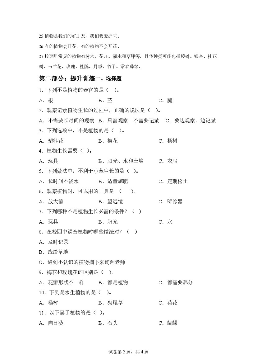 小学 第一单元 周围的植物(期中专项训练)一年级科学上学期(教科版·新教材)