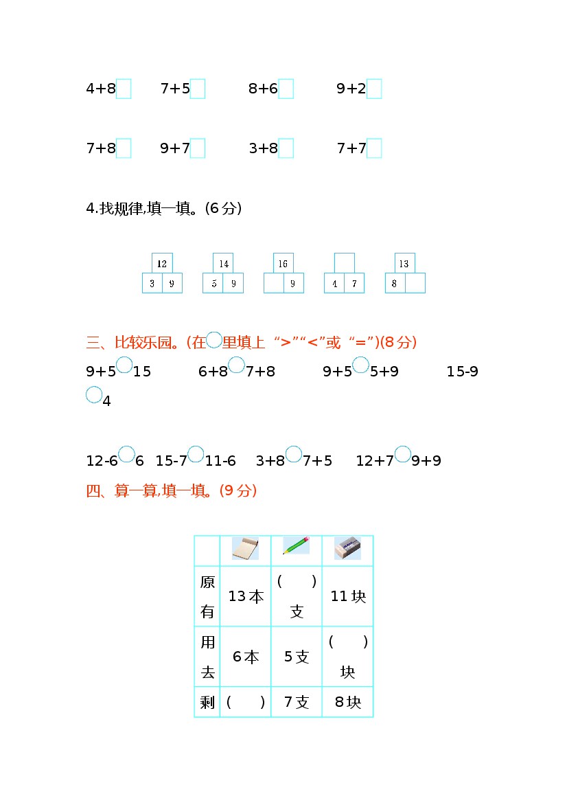 小学 一上数学(北京版)(17)--第9单元测试卷