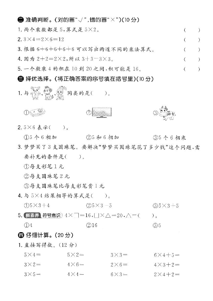 小学 二年级(上)数学月考测试卷一《青岛63版》