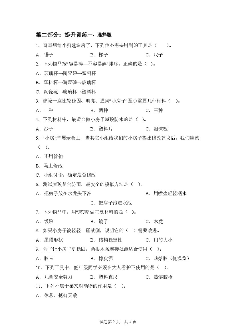 首页 > 全部 > 专项练习 > 第一单元 造房子(期中专项训练)二年级科学上学期(教科版·新教材)