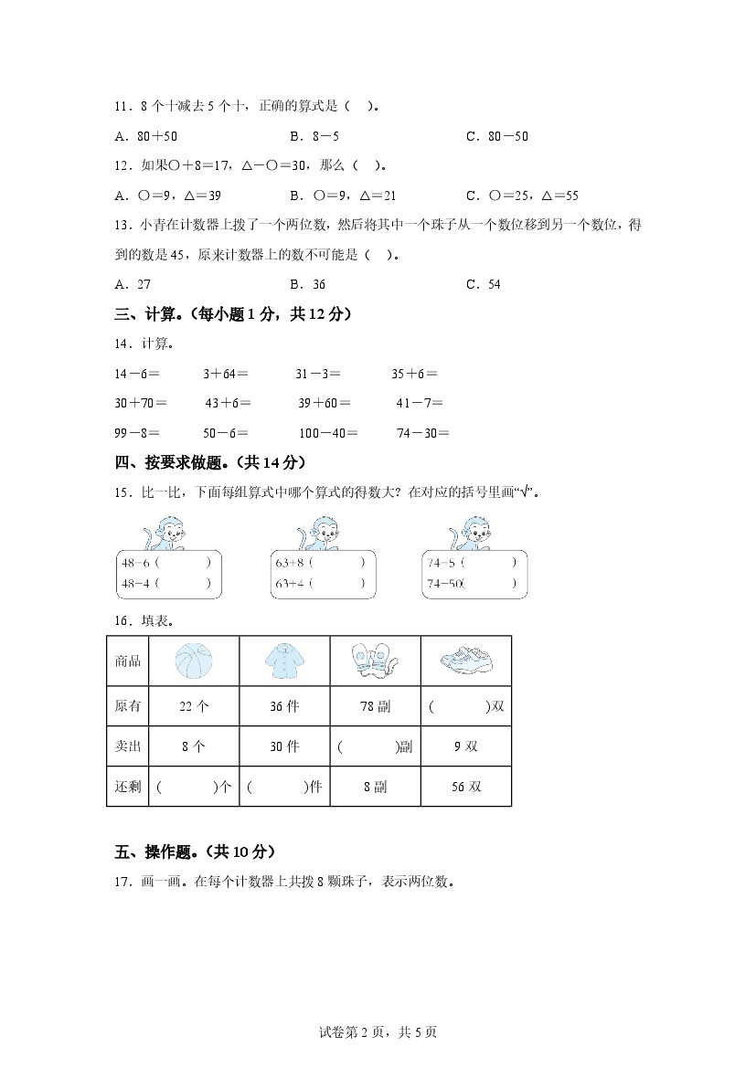 青岛版数学一年级下册第五单元《100以内的加减法(一)》单元测试卷