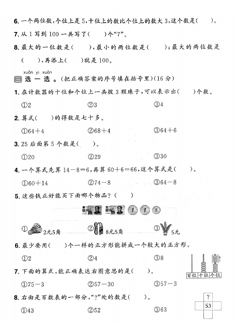 小学 25春青岛54一年级下册数学期中模拟测试卷4页2