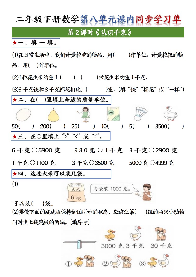 小学 二年级下册数学第八单元课内同步学习单-m