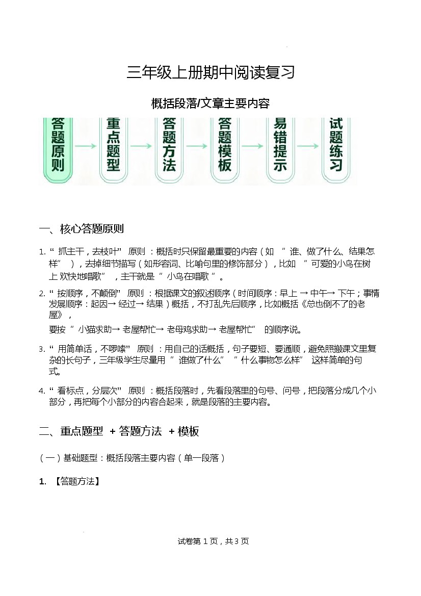 阅读专题02:概括段落、文章主要内容(期中专项训练)三年级语文上学期(统编版·新教材)