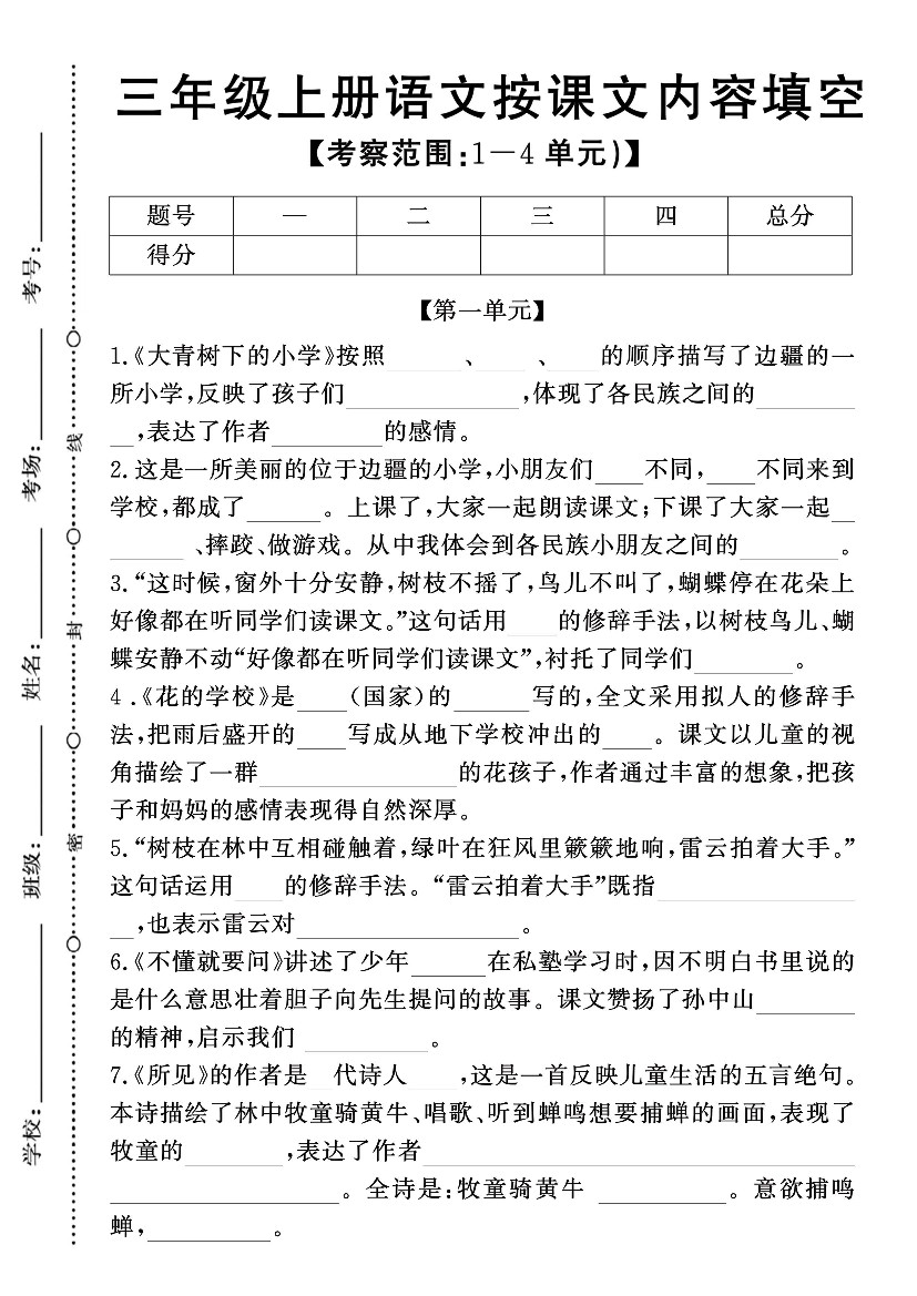 新三上语文期中1-4单元按课文内容填空 (含答案8页)