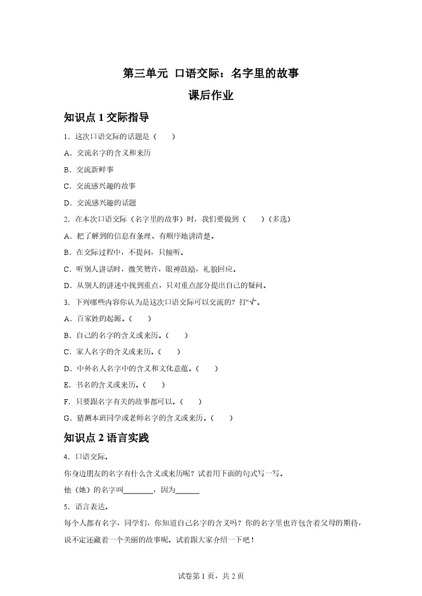 25年秋【三上语文】第三单元口语交际:名字里的故事课后作业