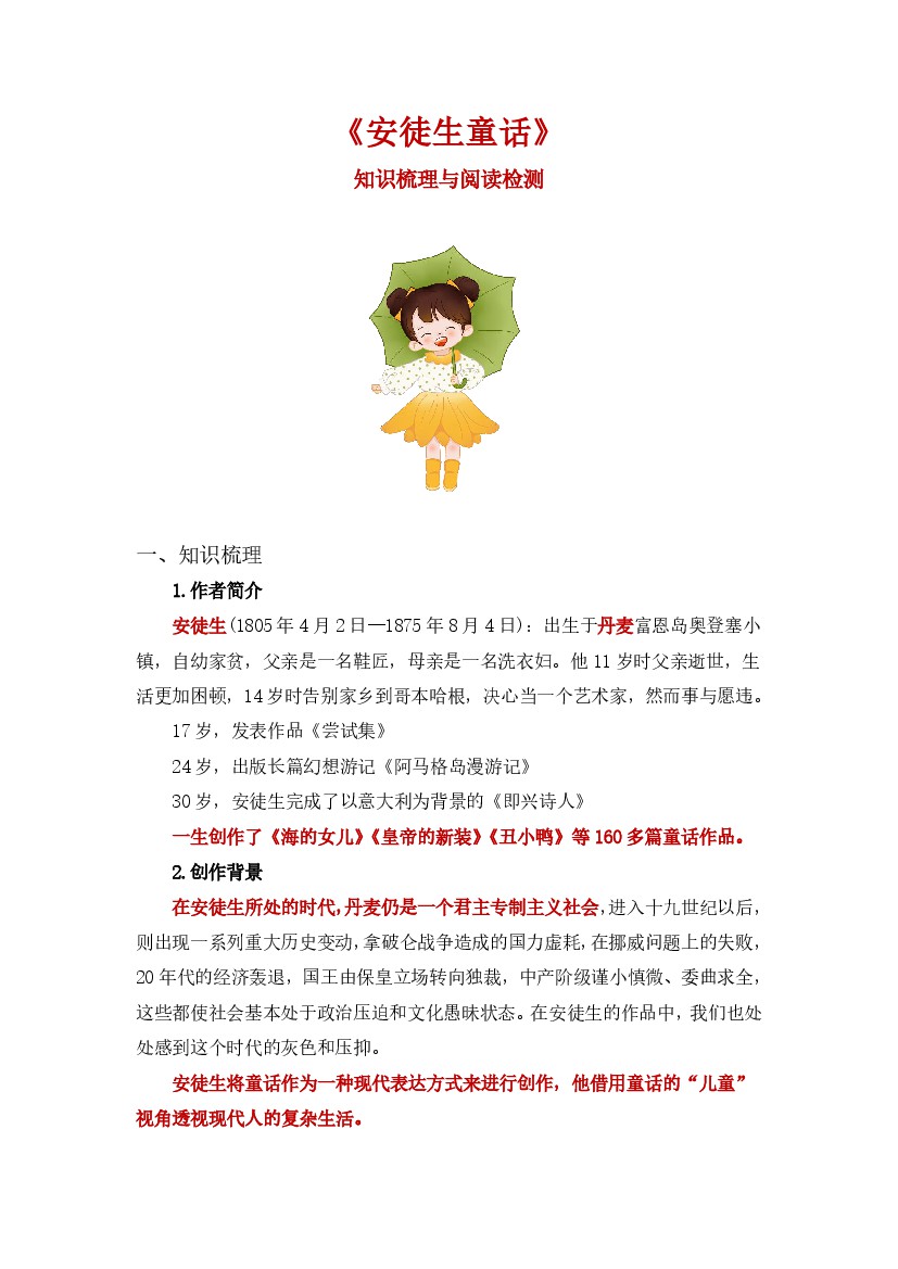 三年级(上)语文 《安徒生童话》整本书阅读 知识梳理与阅读检测