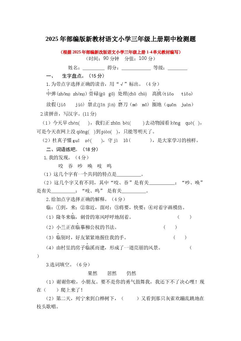 25年三上语文期中模拟题(有答案)