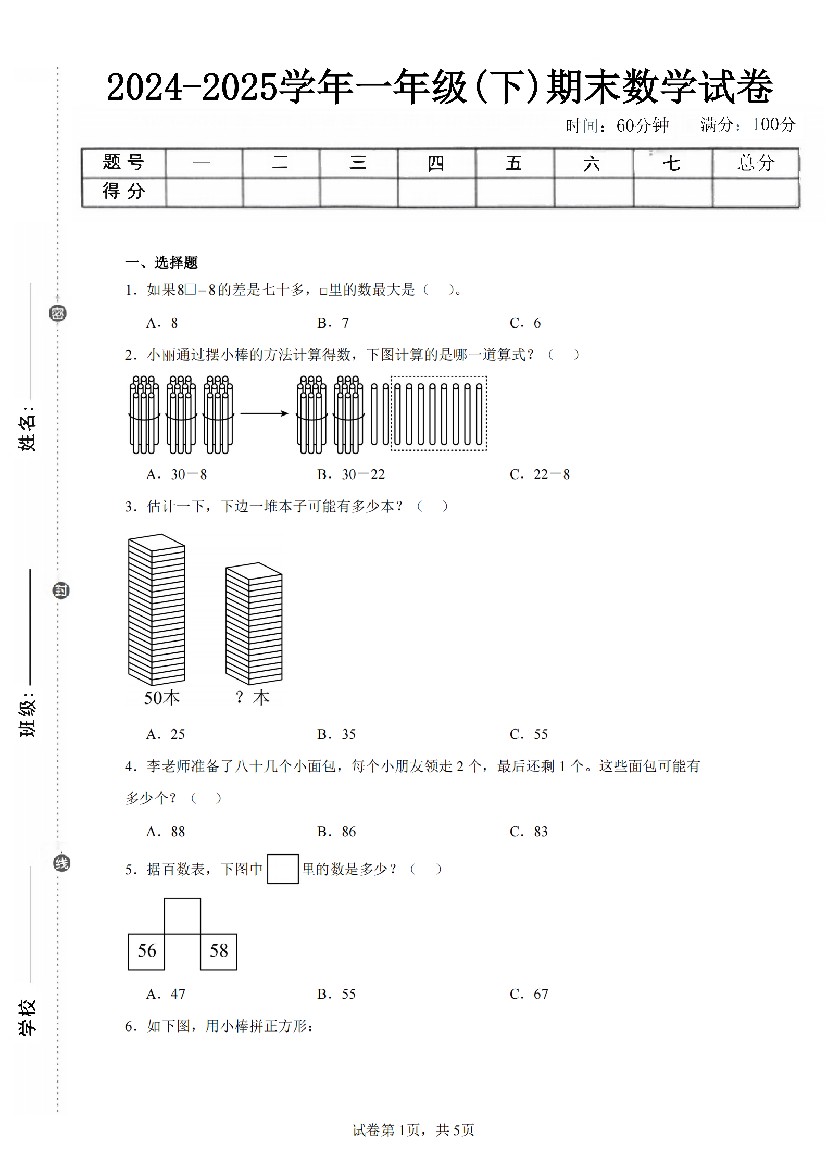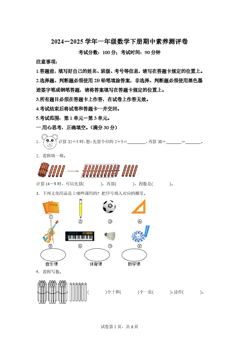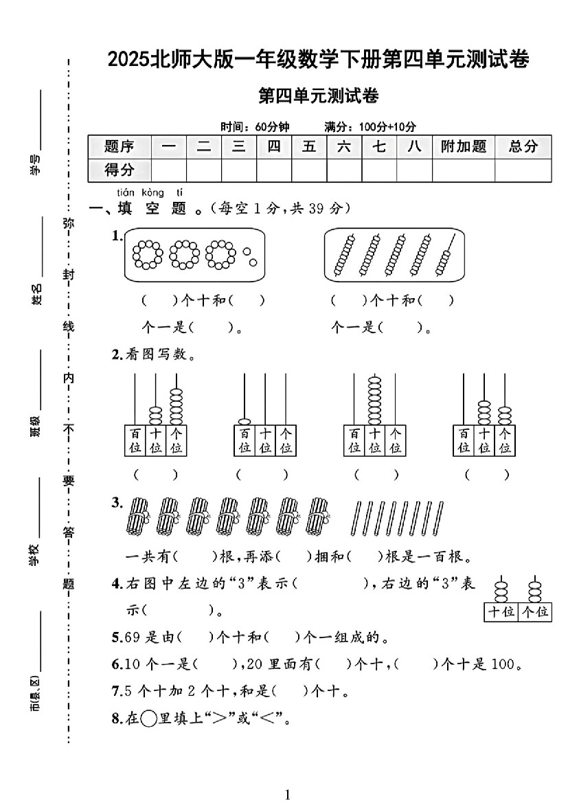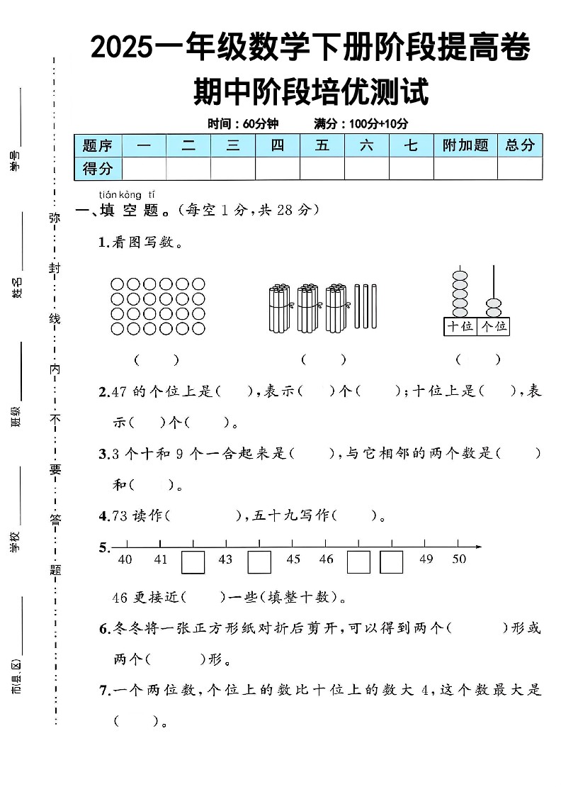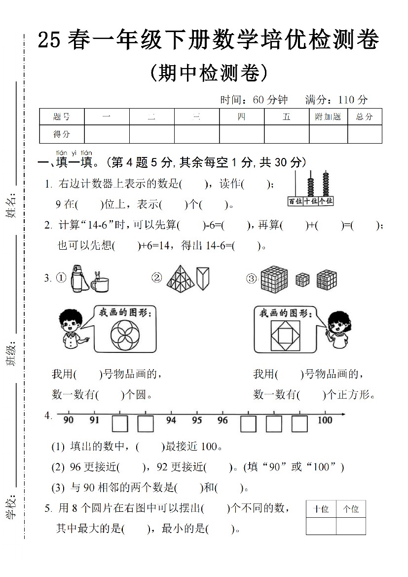 25春一年级下册数学期中培优测试卷-右边计数4页